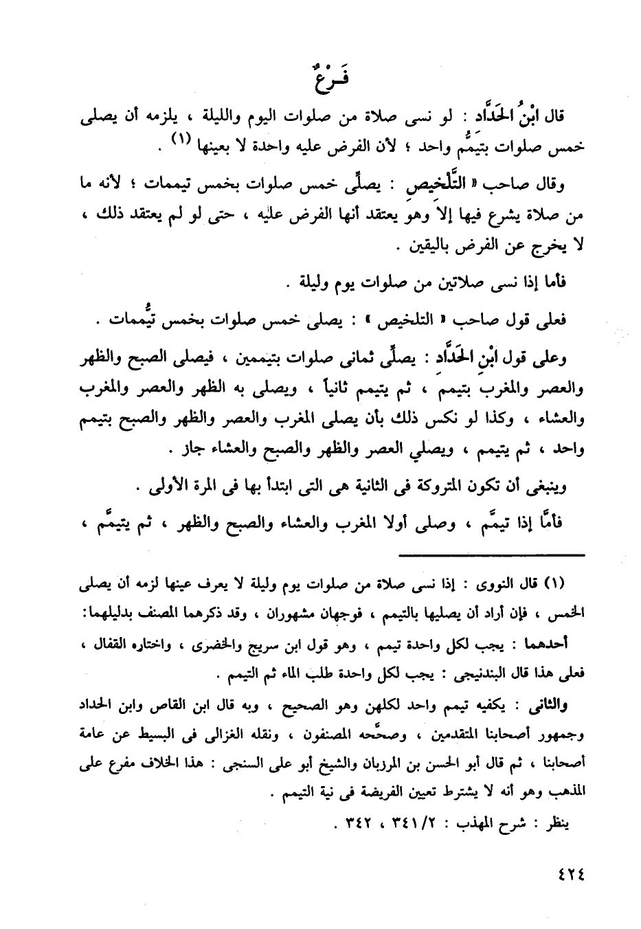 قال ابن الحداد: لو نسي صلاة من صلوات اليوم والليلة، يلزمه أن يصلي خمس صلوات بتيمم واحد، لأن الفرض عليه واحد لا بعينها.