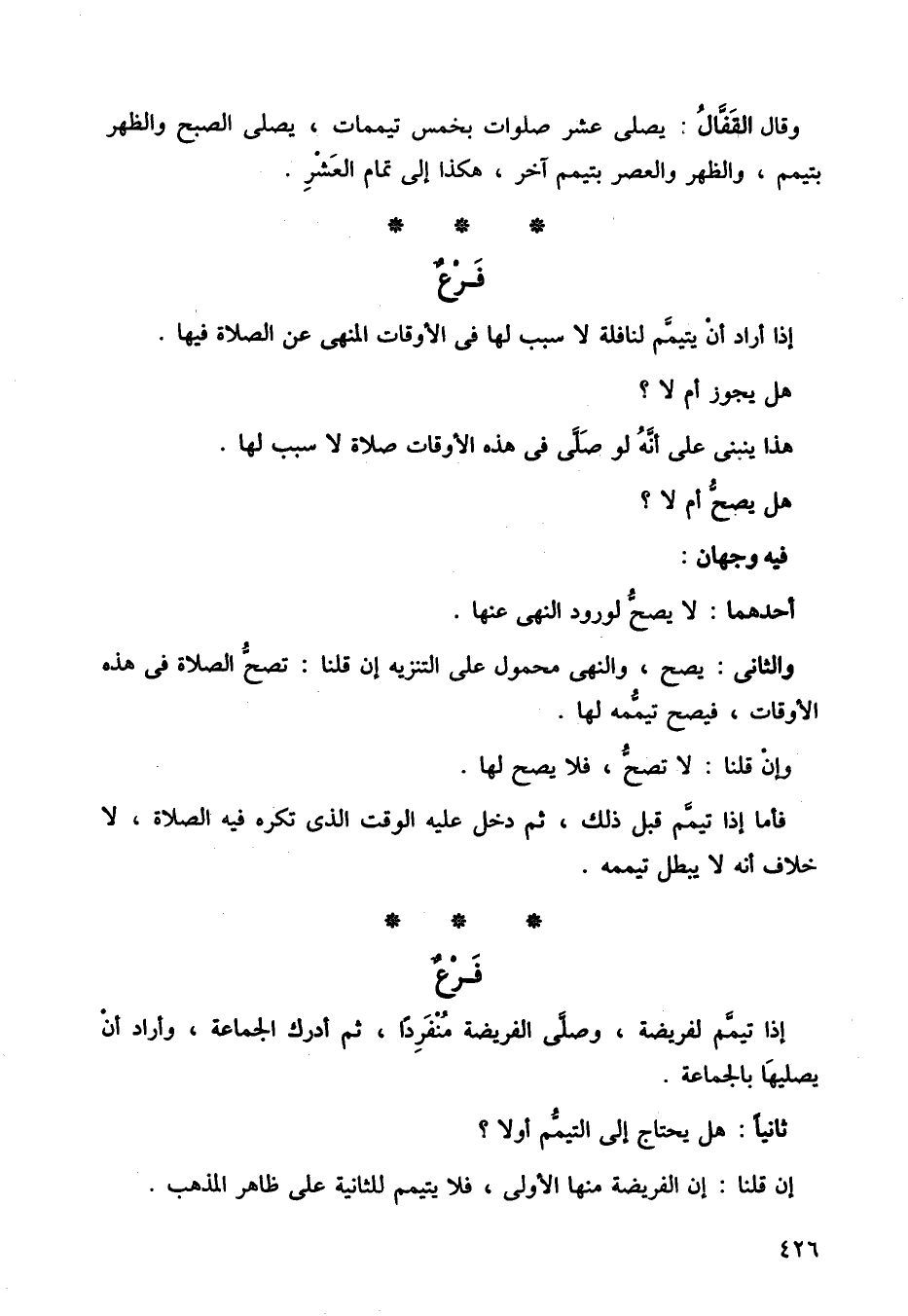 وقال القفال: يصلي عشر صلوات بخمس تيممات، يصلي الصبح والظهر بتيمم، والظهر والعصر بتيمم آخر، هكذا إلى تمام العشر.