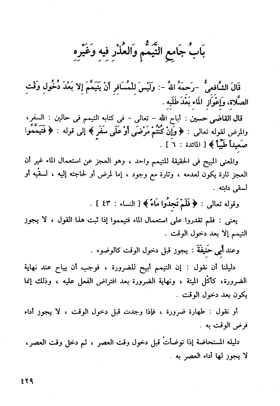 قال الشافعي رحمه الله: وليس للمسافر أن يتمم إلا بعد دخول وقت الصلاة وإعواز الماء بعد طلبه.