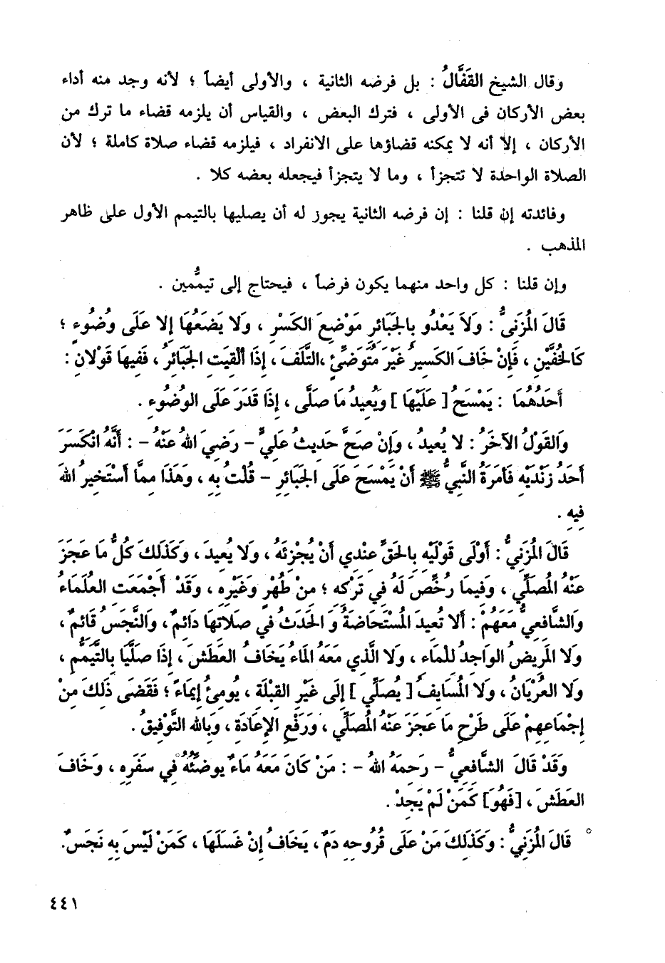 قال المزني: أولى قوليه بالحق عندي أن يجزئه، ولا يعيد، وكذلك كل ما عجز عنه المصلي، وفيما رخص له في تركه، من طهر ولا غيره، وقد أجمعت العلماء والشافعي معهم: ألا تعيد المستحاضة والحدث في صلاتها دائم، والنجس قائم ولا المريض الواجد للما، ولا الذي معه الماء يخاف العطش، إذا صليا بالتيمم، ولا العريان، ولا المسابف يصلي إلى غير القبلة يومي إيماء فقضى ذلك من إجماعهم على طرح ما عجز عنه المصلي، ورفع الإعادة وبالله التوفيق.
