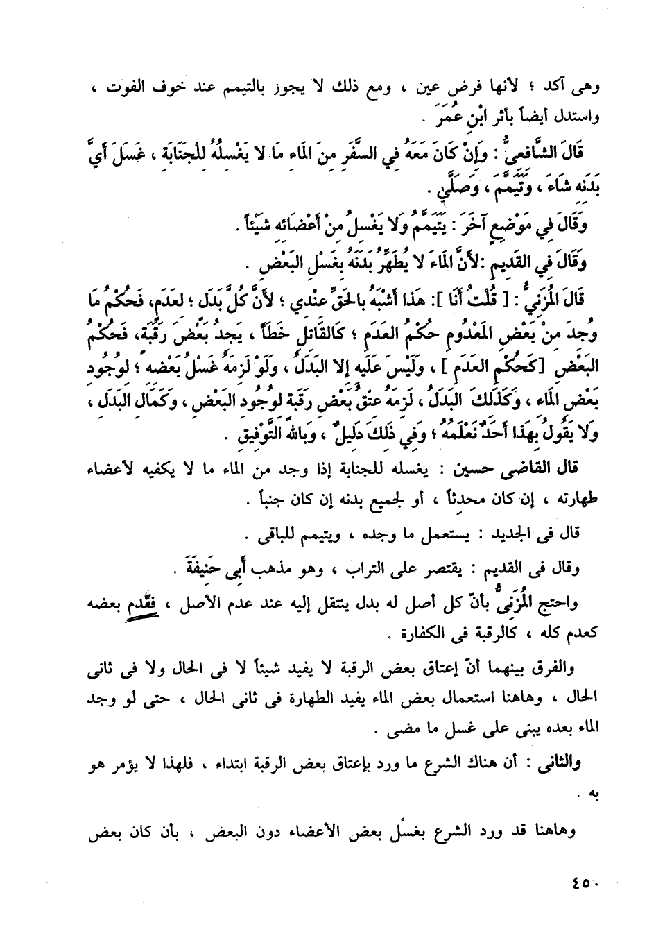 وقال في موضع آخر، يتيمم ولا يغسل من أعضائه شيئا، وقال في القديم، لأن الماء لا يطهر بدنه بغسل البعض. قال المزني [قلت أنا]: هذا أشبه بالحق عندي، لأن كل بدل لعدم فحكم ما وجد من بعض المعدوم حكم العدم، كالقاتل خطأ، يجد بعض رقبة، فحكم البعض [كحكم العدم]، وليس عليه إلا البدل، ولو لزمه غسل بعضه، لوجود بعض الماء، وكذلك البدل، لزمه عتق بعض رقبة لوجود البعض، وكمال البدل، ولا يقول بهذا أحد نعلمه، وفي ذلك دليل، وبالله التوفيق.