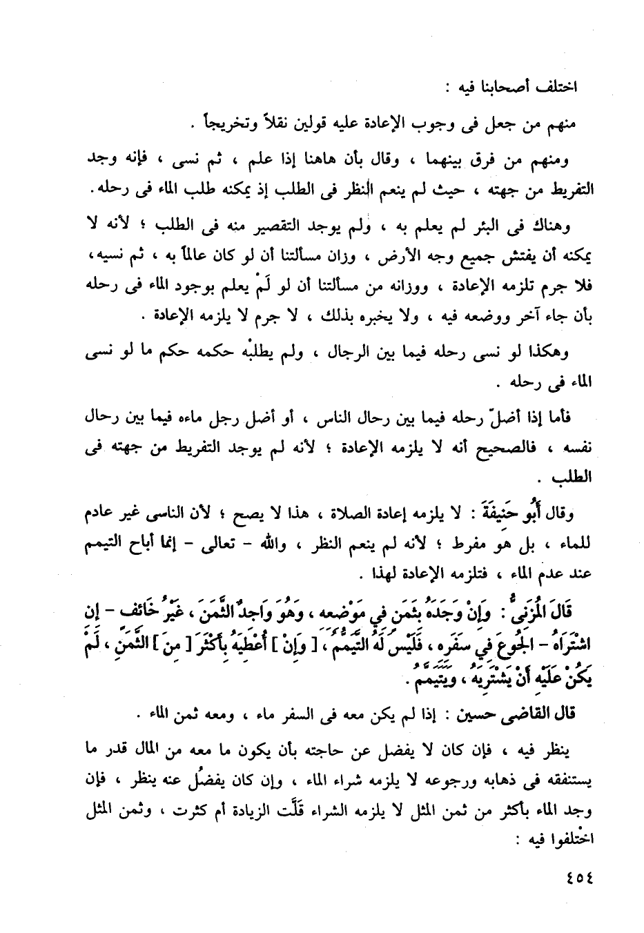 وقال أبو حنيفة: لا يلزمه إعادة الصلاة، هذا لا يصح لأن الناسي غير عادم للماء، بل هو مفرط، لأنه لم ينعم النظر، والله تعالى إنما أباح التيمم عند عدم الماء، فلتزمه الإعادة لهذا.