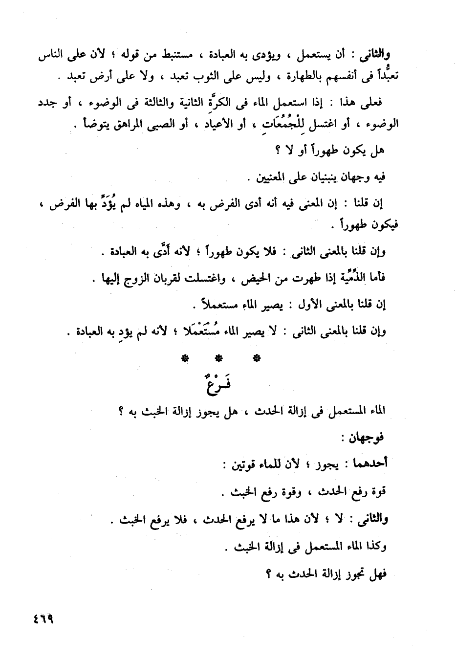 والثاني: أن يستعمل، ويؤدي به العبادة، مستنبط من قوله، لأن على الناس تعبدًا في أنفسهم بالطهارة، وليس على الثوب تعبد، ولا على أرض تعبد.