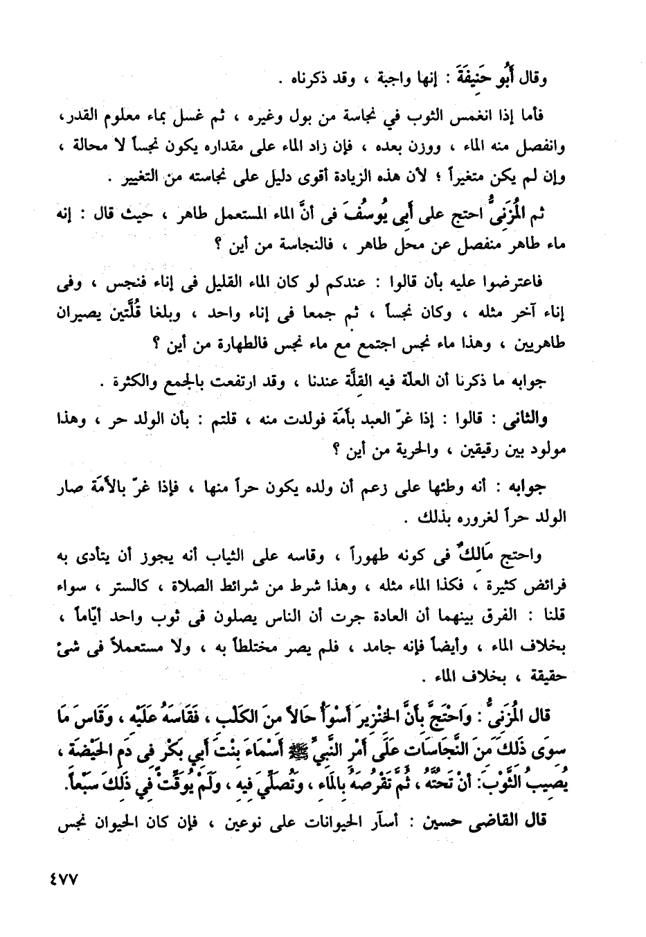 ثم المزني احتج على أبي يوسف في أن الماء المستعمل طاهر، حيث قال: إنه ماء طاهر منفصل عن محل طاهر، فالنجاسة من أين.
