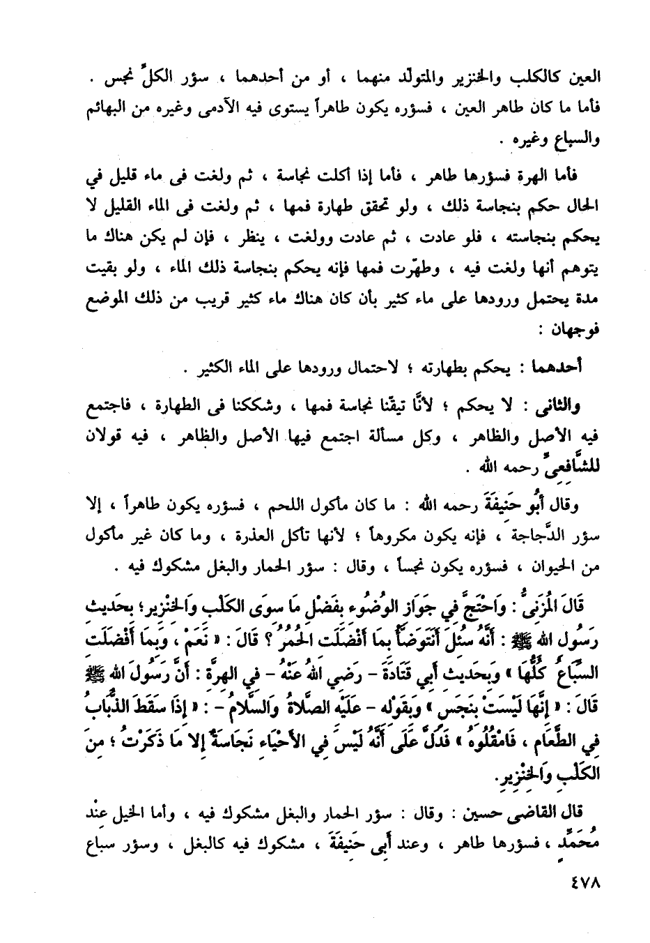 قال المزني: واحتج في جواز الوضوء بفضل ما سوى الكلب والخنزير بحديث رسول الله صلى الله عليه وسلم أنه سئل أنتوضأ بما أفضلت الحمر: قال نعم، وبما أفضلت السباع كلها، وبحديث أبي قتادة رضي الله عنه في الهرة أن رسول الله صلى الله عليه وسلم قال إنها ليست بنجس وبقوله عليه الصلاة والسلام إذا سقط الذباب في الطعام، فامقلوه، فدل على أنه ليس في الأحياء نجاسة إلا ما ذكرت من الكلب والخنزير.