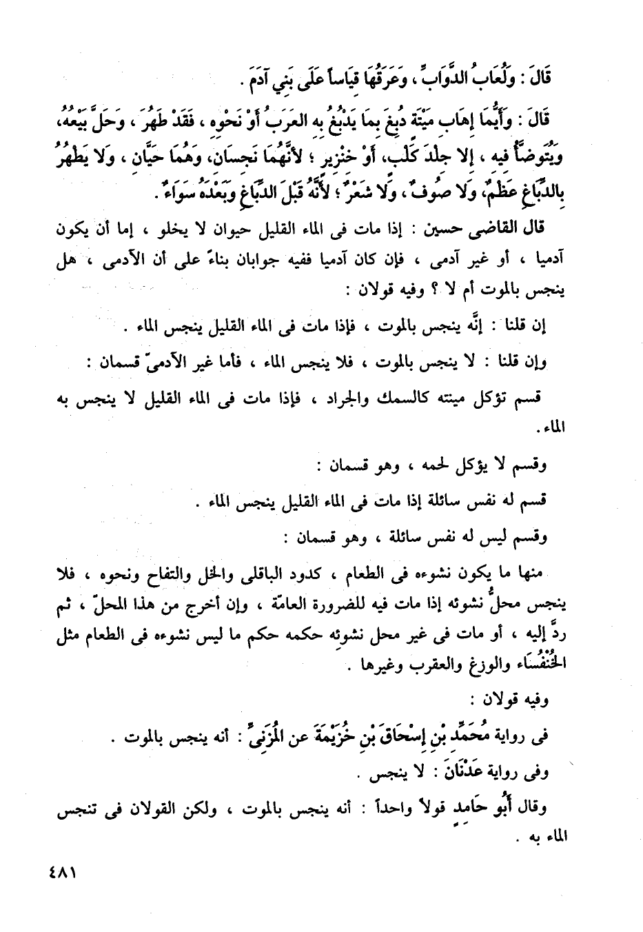 منها ما يكون نشوءه في الطعام، كدود الباقي والخلي والتفاح ونحوه، فلا ينجس محل نشوئه إذا مات فيه للضرورة العامة، وإن أخرج من هذا المحل، ثم رد إليه، أو مات في غير محل نشوئه حكمه حكم ما ليس نشوءه في الطعام مثل الخنفساء والوزغ والعقرب وغيرها.