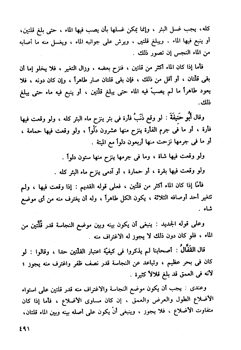 وعندي: يجب أن يكون موضع النجاسة والاغترف منه قدر قلتين على استواء الأضلاع الطول والعرض والعمق، إن كان مساوي الأضلاع، فأما إذا كان متفاوت الأضلاع فلا يجوز، وينبغي أن يكون على أصله بينه وبين الماء قلتان،