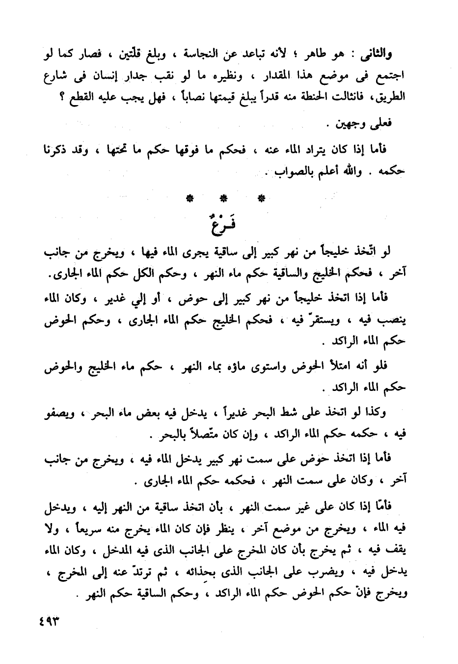 لو اتخذ خليجًا من نهر كبير إلى ساقية يجري الماء فيها، ويخرج من جانب آخر، فحكم الخليلج والساقية حكم ماء النهر، وحكم الكل حكم الماء الجاري فأما إذا اتخذ خليجًا من نهر كبير إلى حوض، أو إلى غدير، وكان الماء ينصب فيه، ويستقر فيه، فحكم الخليلج حكم الماء الجاري، وحكم الحوض حكم الماء الراكد.