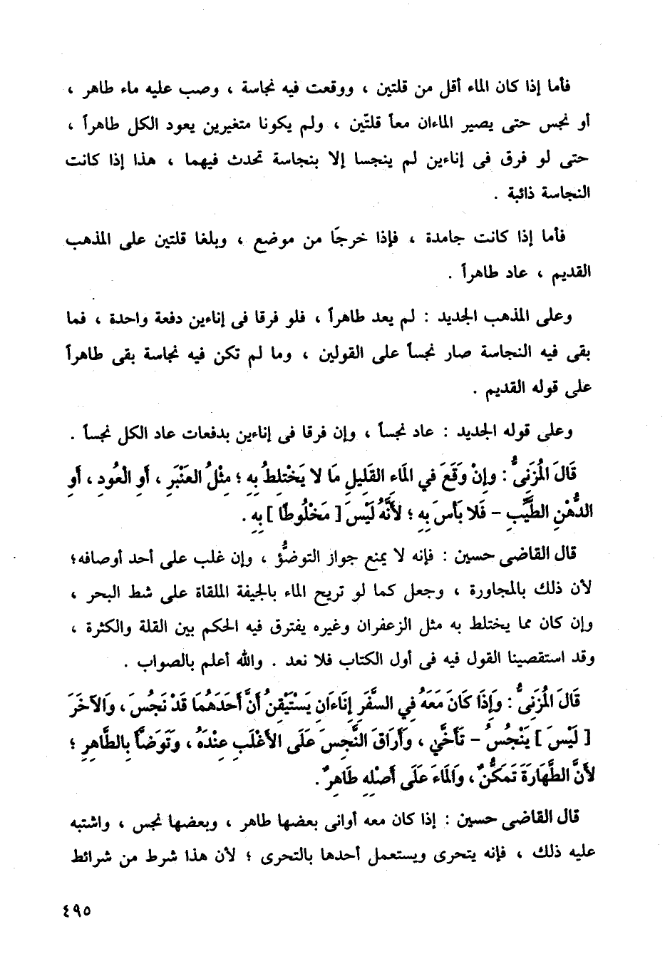 فأما إذا كان الماء أقل من قلتين، ووقعت فيه نجاسة، وصب عليه ماء طاهر أو نجس حتى يصير الماءان معا قلتين، ولم يكونا متغيرين يعود الكل طاهرا، حتى لو فرق في إنائين لم ينجسا، إلا بنجاسة تحدث فيهما، هذا إذا كانت النجاسة ذائبة.