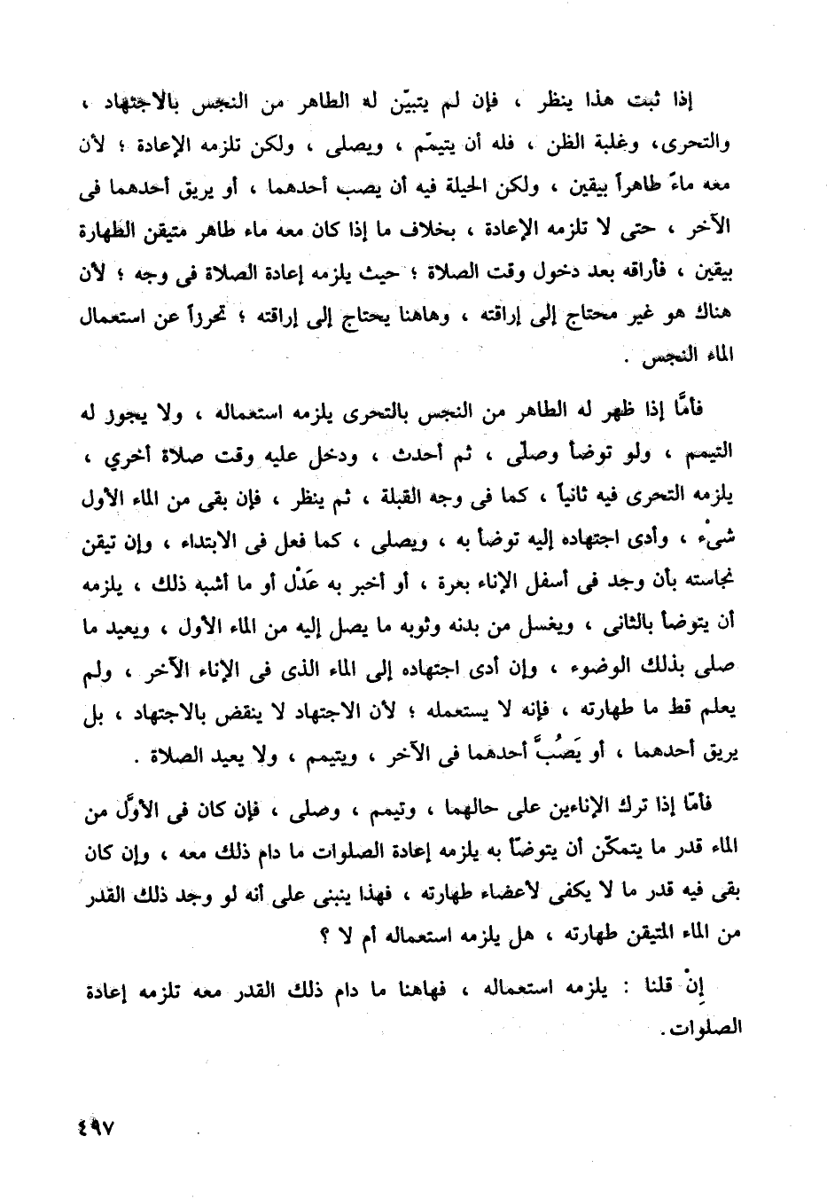 إذا ثبت هذا ينظر، فإن لم يتبين له الطاهر من النجس بالاجتهاد، والتحرى، وغلبة الظن، فله أن يتيمم، ويصلي ولكن تلزمه الإعادة، لأن معه ماء طاهرًا بيقين، ولكن الحيلة فيه أن يصب أحدهما، أو يريق أحدهما في الآخر، حتى لا تلزمه الإعادة، بخلاف ما إذا كان معه ماء طاهر متين الطهارة بيقين، فأراقه بعد دخول وقت الصلاة، حيث يلزمه إعادة الصلاة في وجه، لأن هناك هو غير محتاج إلى إراقته، وها هنا يحتاج إلى إراقته، تحرزًا عن استعمال الماء النجس.