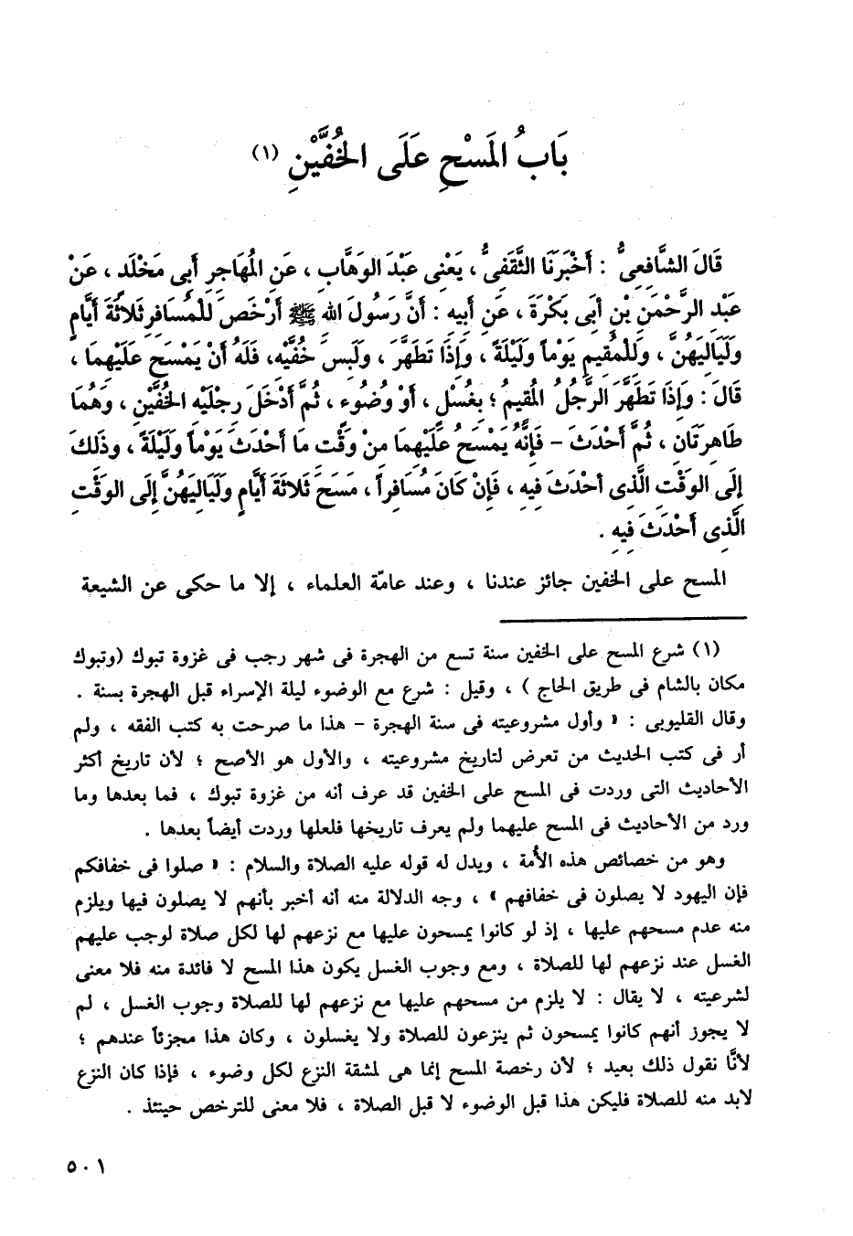 المسح على الخفين جائز عندنا، وعندنا عامة العلماء، إلا ما حكي عن الشيعة