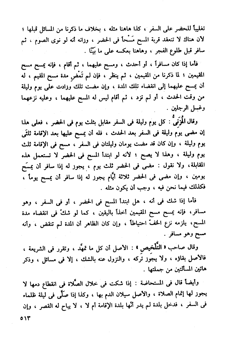 فأما إذا شك في أنه، هل ابتدأ المسح في الحضر، أو في السفر، وهو مسافر فإنه يمسح مسح المقيمين أخذا باليقين، كما لو شك في انقضاء مدة المسح يلزمه نزع الخف احتياطًا، وإن كان الظاهر أن المدة لم تنقض، وأنه مسح وهو مسافر، وقال صاحب التلخيص، الأصل أن كل ما تمهد، وتقرر في الشريعة، فالأصل بقاؤه، ولا يجوز تركه، والنزول عنه بالشك، إلا في مسائل وذكر هاتين المسألتين من جملتها.