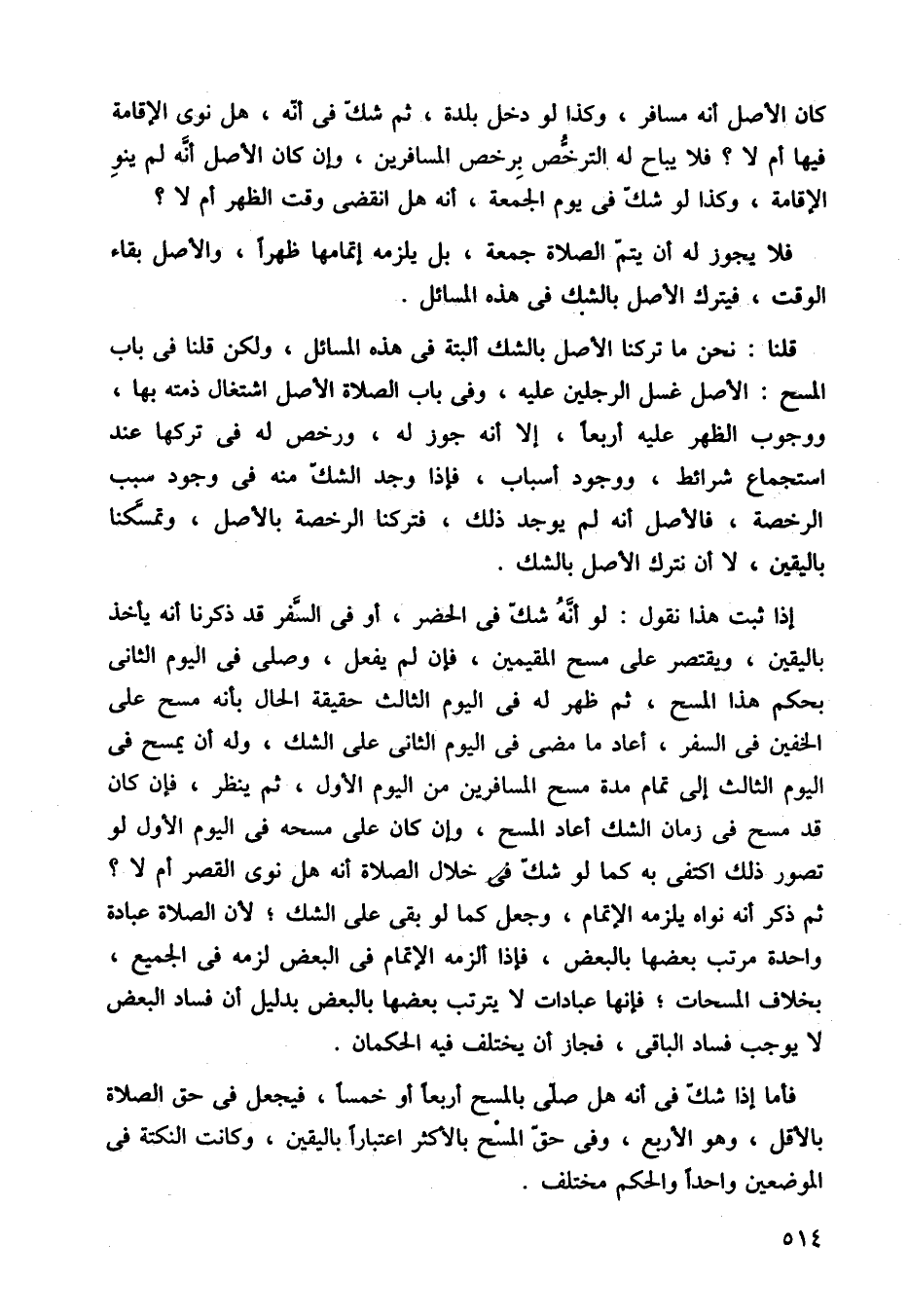 قلنا: نحن ما تركنا الأصل بالشك ألبتة في هذه المسائل ولكن قلنا في باب المسح: الأصل غسل الرجلين عليه، وفي باب الصلاة الأصل اشتغال ذمته بها، ووجوب الظهر عليه أربعًا، إلا أنه جوز له، ورخص له في تركها عند استجماع شرائط، ووجود أسباب، فإذا وجد الشك منه في وجود سبب الرخصة، فالأصل أنه لم يوجد ذلك، فتركنا الرخصة بالأصل، وتمسكنا بالقين، لا أن نترك الأصل بالشك.