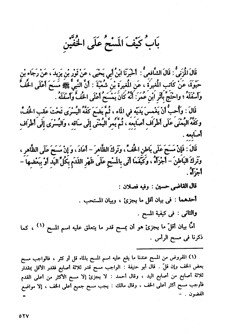 قال المزني: قال الشافعي: أخبرنا ابن أبي يحيى، عن ثور بن يزيد، عن رجاء بن حيوة، عن كاتب المغيرة، عن المغيرة بن شعبة، أن النبي صلى الله عليه وسلم مسح أعلى الخف وأسفله، واحتج بأثر ابن عمر: أنه كان يمسح أعلى الخف وأسفله.