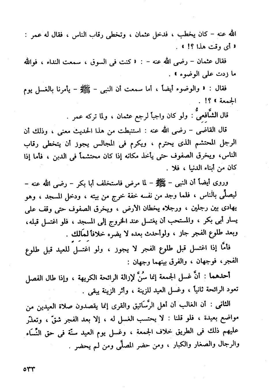 فقال عثمان رضي الله عنه كنت في السوق سمعت النداء فوالله ما زدت على الوضوء، فقال والوضوء أيضا أما سمعت أن النبي صلى الله عليه وسلم يأمرنا بالغسل يوم الجمعة. قال الشافعي ولو كان واجبًا لرجع عثمان ولما تركه عمر.