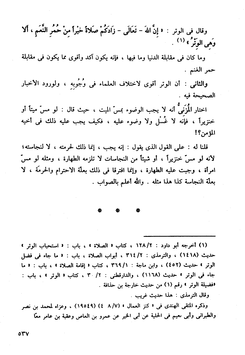 وقال في الوتر: إن الله تعالى زادكم صلاة خيرًا من حمر النعم، ألا وهي الوتر.