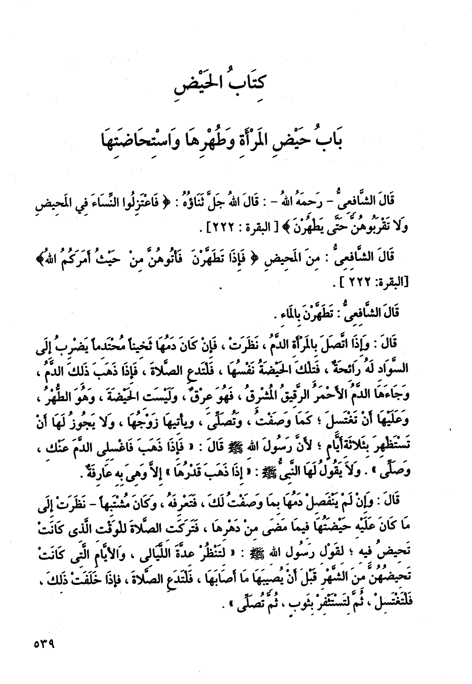 قال الشافعي رحمه الله قال الله جل ثناؤه: (فاعتزلوا النساء في المحيض ولا تقربوهن حتى يطهرن).