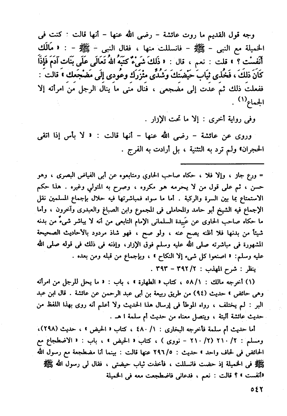 وجه قول القديم ما روت عائشة رضي الله عنها أنها قالت كنت في الخميلة مع النبي صلى الله عليه وسلم فانسللت منها، فقال النبي صلى الله عليه وسلم مالك أنفست، قلت نعم، قال ذلك شيء كتبه الله تعالى على بنات آدم فإذا كان ذلك فخذي ثياب حيضتك وشدي مئزرك وعودي إلى مضجعك، قالت: ففعلت ذلك ثم عدت إلى مضجعي، فنال مني ما ينال الرجل من امرأته إلا الجماع