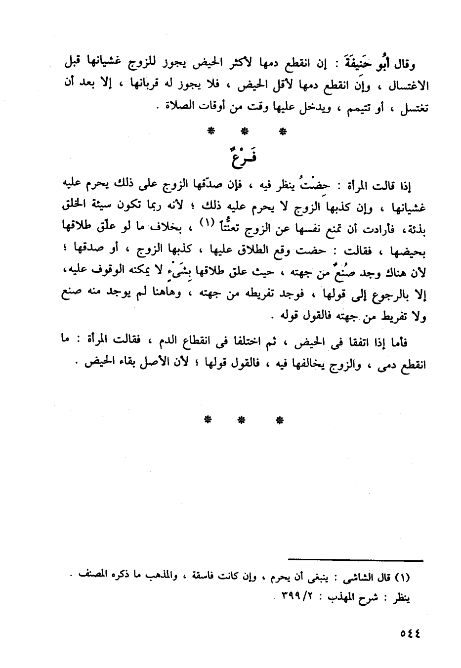 إذا قالت المرأة: حضت ينظر فيه، فإن صدقها الزوج على ذلك يحرم عليه غشيانها، وإن كذبها الزوج لا يحرم عليه ذلك، لأنه ربما تكون سيئة الخلق بذئة، فأرادت أن تمنع نفسها عن الزوج تعنتا، بخلاف ما لو علق طلاقها بحيضها، فقالت: حضت وقع الطلاق عليها، كذبها الزوج، أو صدقها لأن هناك وجد صنع من جهته، حيث علق طلاقها بشيء لا يمكنه الوقوف عليه، إلا بالرجوع إلى قولها، فوجد تفريطه من جهته، وها هنا لم يوجد منه صنع ولا تفريط من جهته القول قوله.