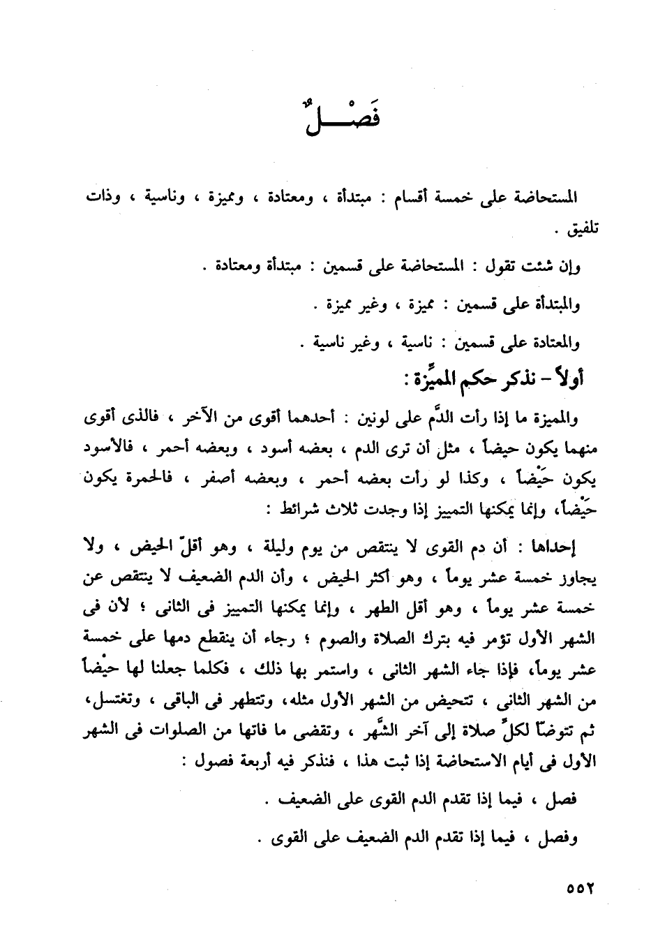 إحداها: أن دم القوى لا ينتقص من يوم وليلة، وهو أقل الحيض، ولا يجاوز خمسة عشر يومًا، وهو أكثر الحيض، وأن الدم الضعف لا ينتقص عن خمسة عشر يومًا، وهو أقل الطهر، وإنما يمكنها التمييز في الثاني، لأن في الشهر الأول تؤمر فيه بترك الصلاة والصوم، رجاء أن ينقطع دمها على خمسة عشر يومًا، فإذا جاء الشهر الثاني، واستمر بها ذلك، فكلما جعلنا لها حيضًا من الشهر الثاني، تتحيض من الشهر الأول مثله، وتتطهر في الباقي، وتغتسل ثم تتوضأ لكل صلاة إلى آخر الشهر، وتقضي ما فاتها من الصلوات في الشهر الأول في أيام الاستحاضة إذا ثبت هذا، فنذكر فيه أربعة فصول: