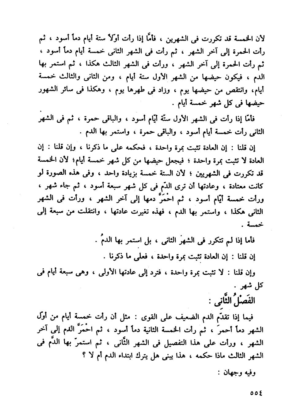 لأن الخمسة قد تكررت في الشهرين، فأما إذا رأت اولا ستة أيام دمًا أسود، ثم رأت الحمرة إلى آخر الشهر، ثم رأت في الشهر الثاني خمسة أيام دما أسود، ثم رأت الحمرة إلى آخر الشهر، ورأت في الشهر الثالث هكذا، ثم استمر بها الدم، وانتقص من حيضها يوم، وزاد في طهرها يوم، وهكذا في سائر الشهور، حيضها في كل شهر خمسة أيام.