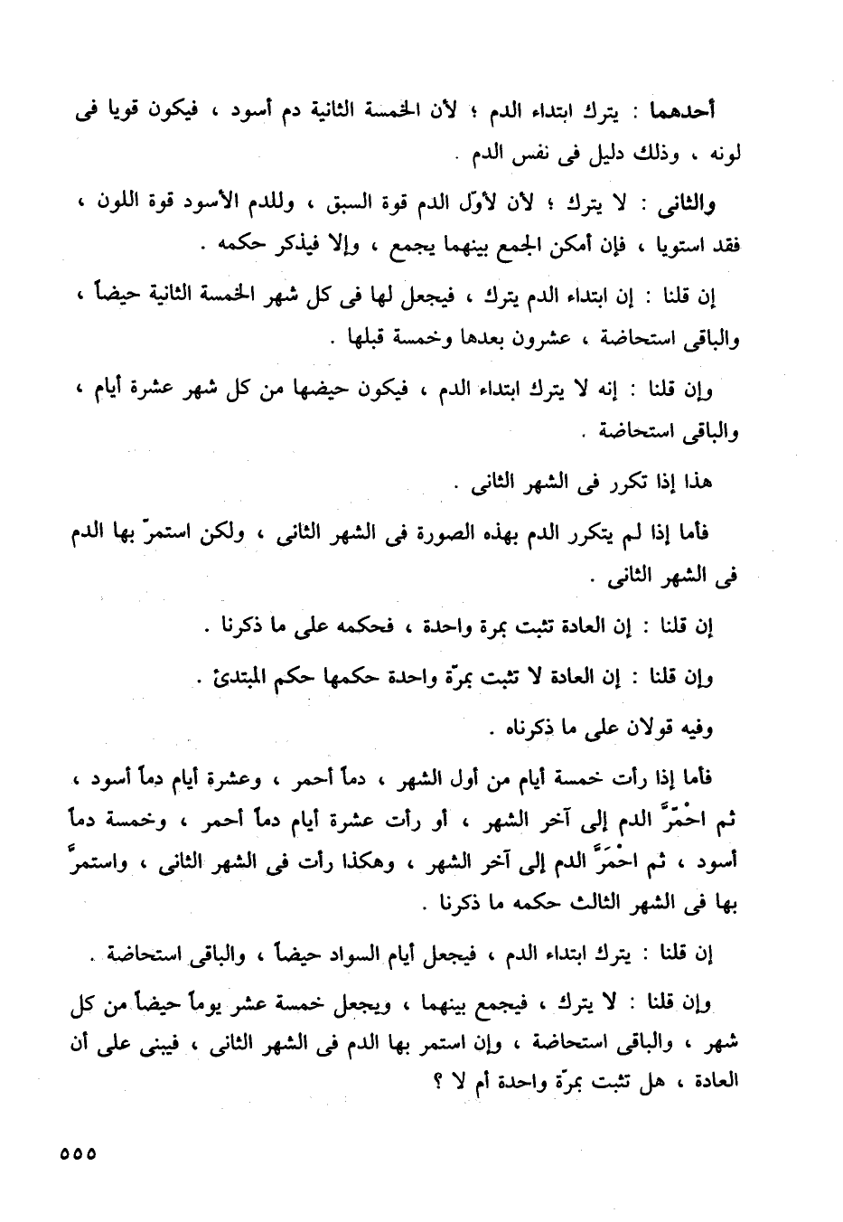 فأما إذا رأت خمسة أيام من أول الشهر، دمًا أحمر، وعشرة أيام دمًا أسود، ثم احمر ادم، إلى آخر الشهر، أو رأت عشرة أيام دمًا أحمر، وخمسة دمًا أسود، ثم احمر الدم إلى آخر الشهر، وهكذا رأت في الشهر الثاني، واستمر بها في الشهر الثالث حكمه ما ذكرنا.