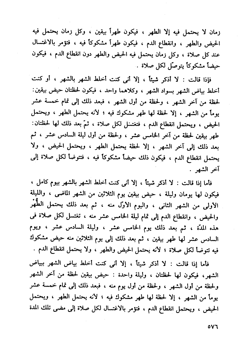 فإذا قالت: لا أذكر شيئًا، إلا أني كنت أخلط الشهر بالشهر، أو كنت أخلط بياض الشهر بسواد الشهر، وكلاهما واحد، فيكون لحظتان حيض بيقين: لحظة من آخر الشهر ولحظة من أول الشهر، فبعد ذلك إلى تمام خمسة عشر يومًا من الشهر إلا لحظة لها طهر مشكوك فيه، لأنه يحتمل الطهر، ويحتمل الحيض، ويحتمل انقطاع الدم، فتغتسل لكل صلاة، ثم بعد ذلك لها لحظتان: طهر بيقين لحظة من آخر الخامس عشر، ولحظة من أول ليلة السادس عشر، ثم بعد ذلك إلى آخر الشهر، إلا لحظة يحتمل الطهر، ويحتمل الحيض، ولا يحتمل انقطاع الدم، فيكون ذلك حيضا مشكوكًا فيه، فتتوضأ لكل صلاة إلى آخر الشهر.