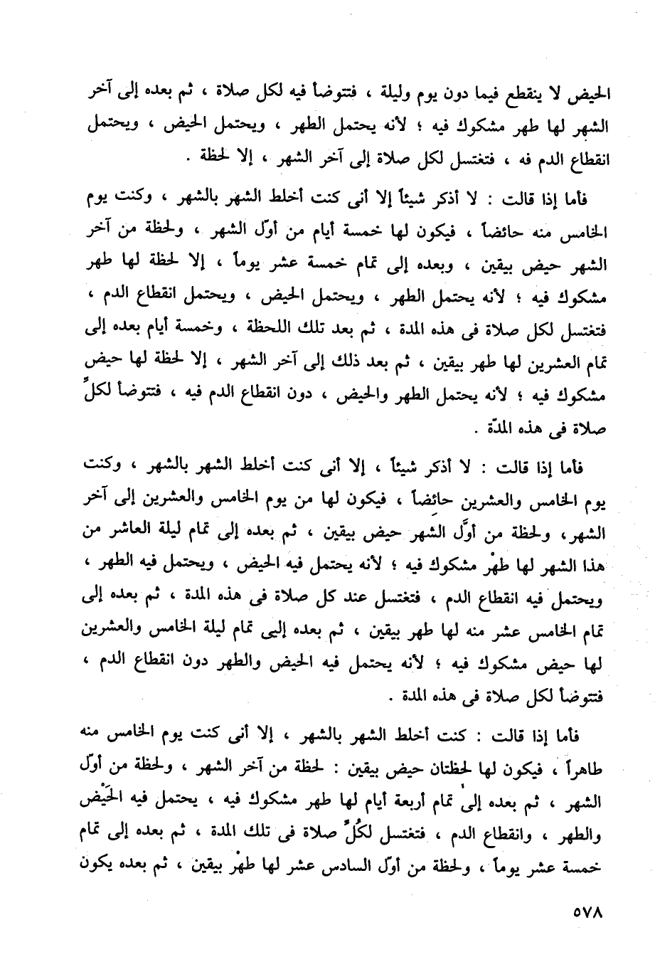 فأما إذا قالت: لا أذكر شيئا إلا أني كنت أخلط الشهر بالشهر، وكنت يوم الخامس منه حائضًا، فيكون لها خمسة أيام من أول الشهر، ولحظة من آخر الشهر حيض بيقين، وبعده إلى تمام خمسة عشر يومًا، إلا لحظة لها طهر مشكوك فيه، لأنه يحتمل الطهر، ويحتمل الحيض، ويحتمل انقطاع الدم، فتغتسل لكل صلاة في هذه المدة، ثم بعد تلك اللحظة، وخمسة أيام بعده إلى تمام العشرين لها طهر بيقين، ثم بعد ذلك إلى آخر الشهر، إلا لحظة لها حيض مشكوك فيه، لأنه يحتمل الطهر والحيض، دون انقطاع الدم فيه، فتتوضأ لكل صلاة في هذه المدة.