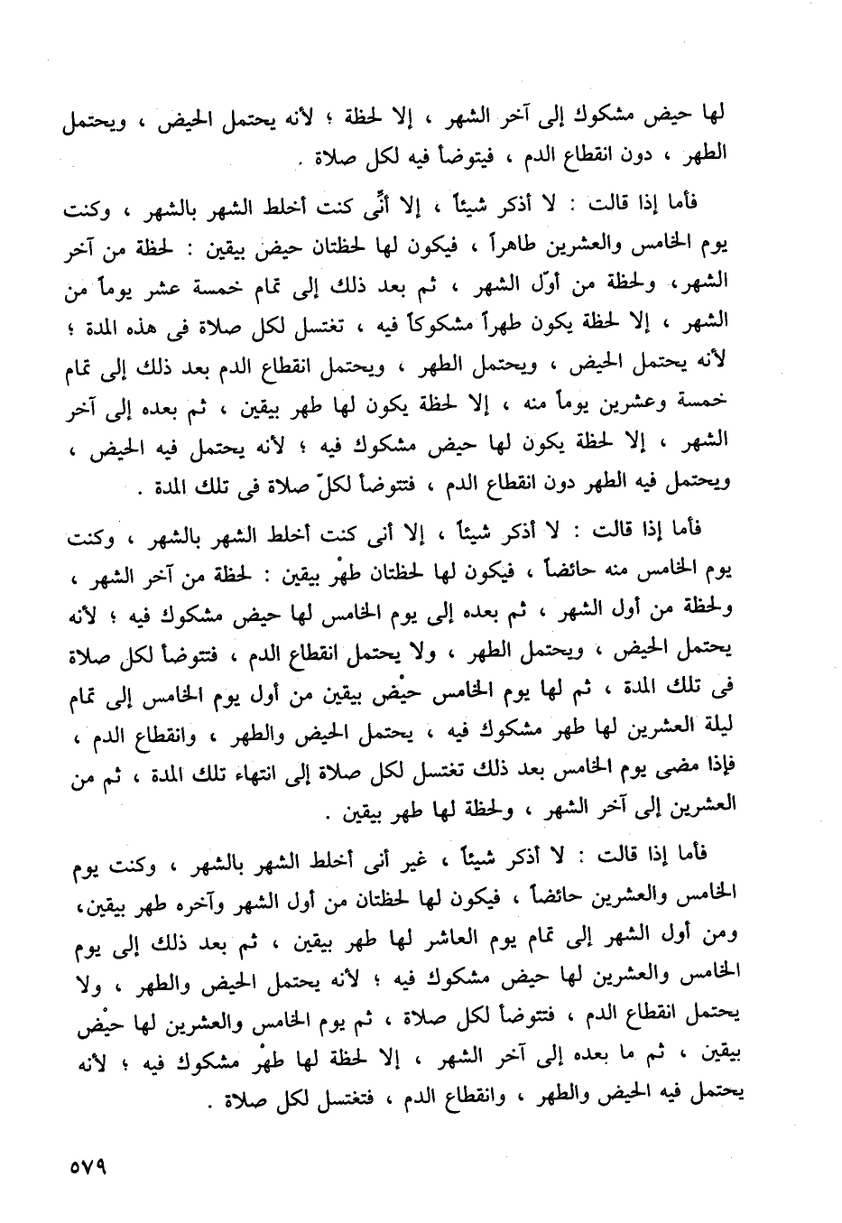 فأما إذا قالت: لا أذكر شيئًا، إلا أني كنت أخلط الشهر بالشهر، وكنت يوم الخامس منه حائضًا، فيكون لها لحظتان طهر بيقين: لحظة من آخر الشهر، ولحظة من أول الشهر، ثم بعده إلى يوم الخامس لها حيض مشكوك فيه، لأنه يحتمل الحيض ويحتمل الطهر، ولا يحتمل انقطاع الدم، فتتوضأ لكل صلاة في تلك المدة، ثم لها يوم الخامس حيض بيقين من أول يوم الخامس إلى تمام ليلة العشرين لها طهر مشكوك فيه، يحتمل الحيض والطهر، وانقطاع الدم فإذا مضى يوم الخامس بعد ذلك تغتسل لكل صلاة إلى انتهاء تلك المدة ثم من العشرين إلى آخر الشهر، ولحظة لها طهر بيقين.