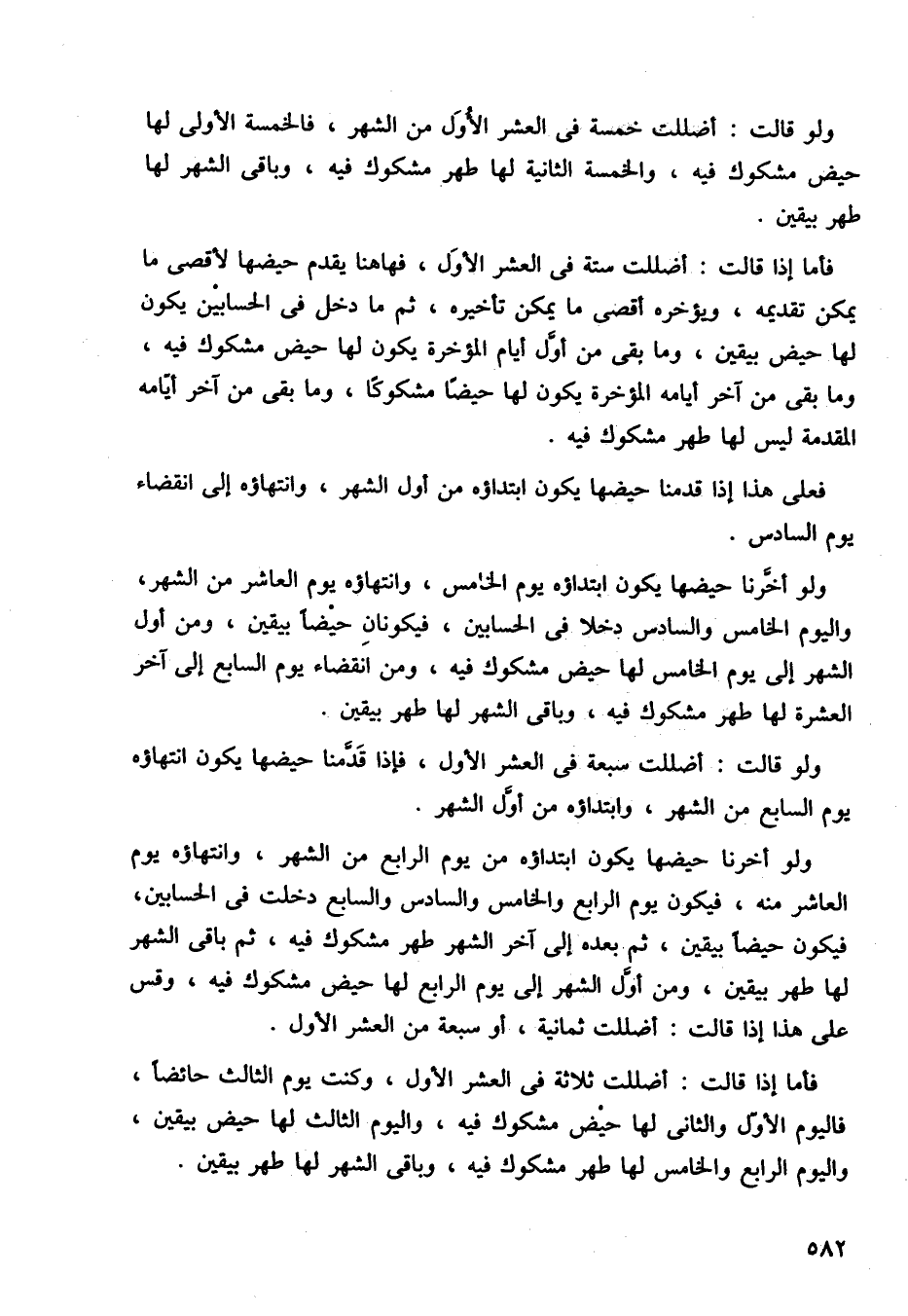 ولو أخرنا حيضها يكون ابتداؤه من يوم الرابع من الشهر، وانتهاؤه يوم العاشر منه، فيكون يوم الرابع والخامس والسادس والسابع دخلت في الحسابين، فيكون حيضا بيقين، ثم بعده إلى آخر الشهر طهر مشكوك فيه، ثم باقي الشهر لها طهر بيقين، ومن اول الشهر إلى يوم الرابع لها حيض مشكوك فيه، وقس على هذا إذا قالت: أضللت ثمانية، أو سبعة من العشر الأول.