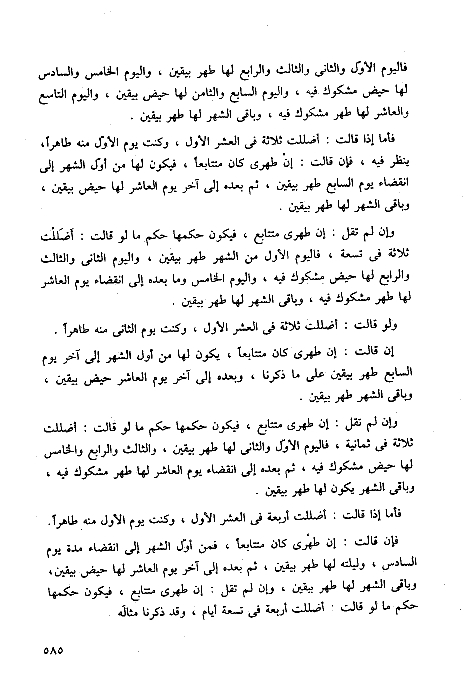 وإن لم تقل: إن طهرى متتابع، فيكون حكمها حكم ما لو قالت: أضللت ثلاثة في ثمانية، فاليوم الأول والثاني لها طهر بيقين، والثالث والرابع والخامس لها حيض مشكوك فيه، ثم بعده إلى انقضاء يوم العاشر لها طهر مشكوك فيه، وباقي الشهر يكون لها طهر بيقين.