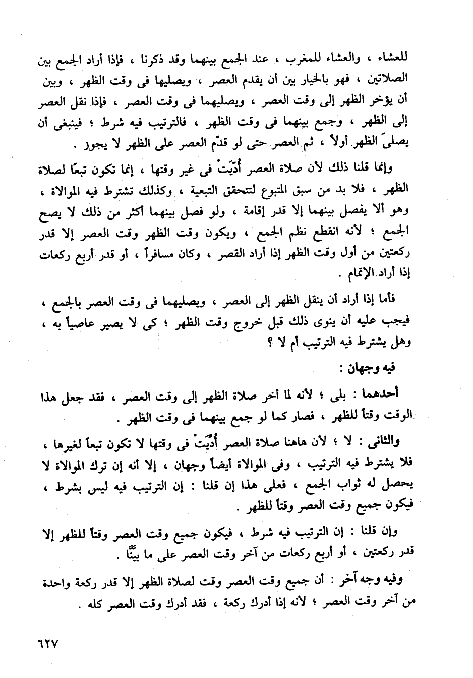 وإنما قلنا ذلك لأن صلاة العصر أديت في غير وقتها، إنما تكون تبعًا لصلاة الظهر، فلابد من سبق المتبوع لتتحقق التبعية، وكذلك تشترط فيه الموالاة، وهو ألا يفصل بينهما إلا قدر إقامة، ولو فصل بينهما أكثر من ذلك لا يصح الجمع، لأنه انقطع نظم الجمع، ويكون وقت الظهر وقت العصر إلا قدر ركعتين من أول وقت الظهر إذا أراد القصر، وكان مسافرًا، أو قدر أربع ركعات إذا أراد الإتمام.