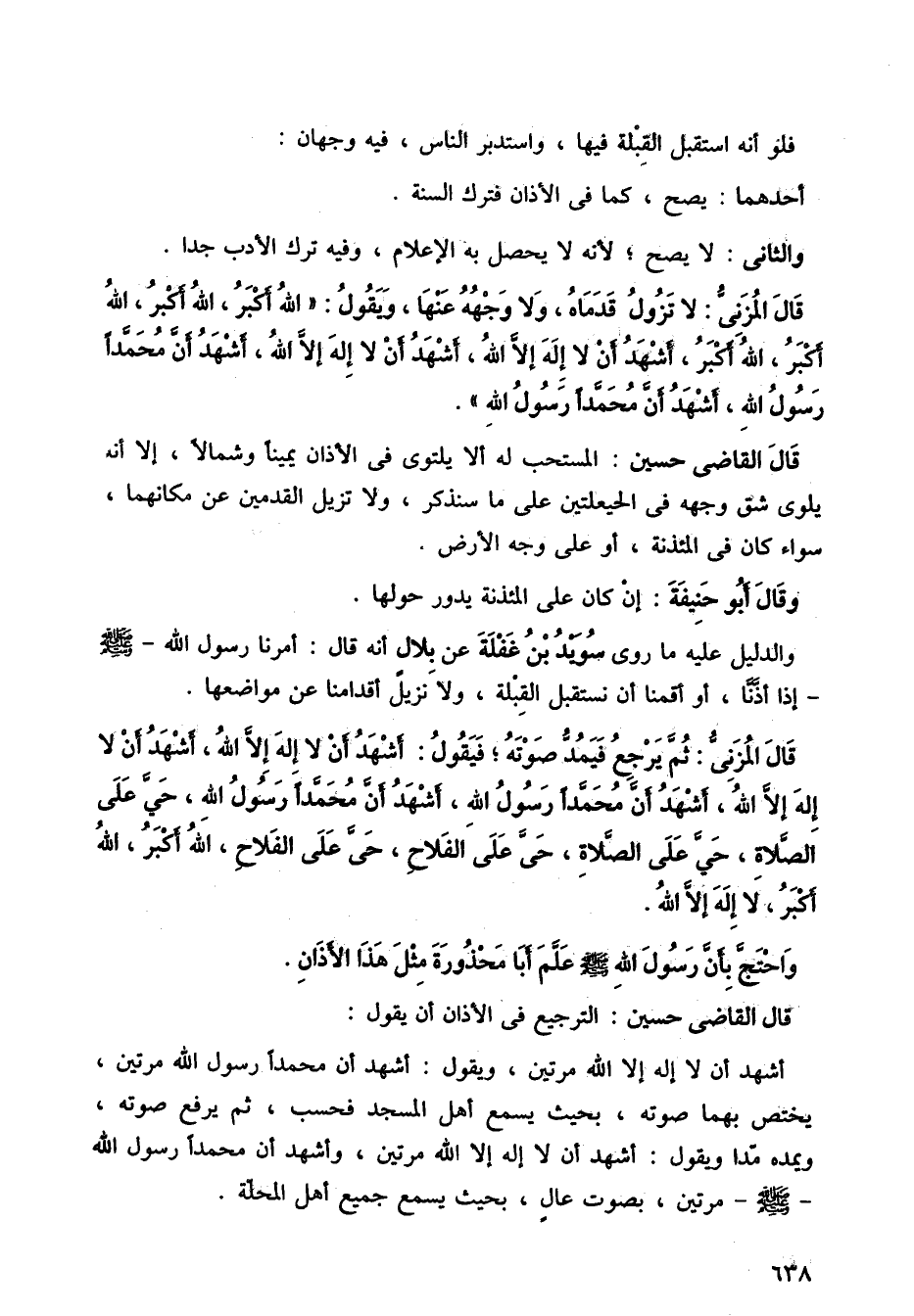 والدليل عليه ما روى سويد بن غفلة عن بلال انه قال أمرنا رسول الله صلى الله عليه وسلم إذا أذنا، أو أقمنا أن نستقبل القبلة، ولا نزيل أقدامنا عن مواضعها.