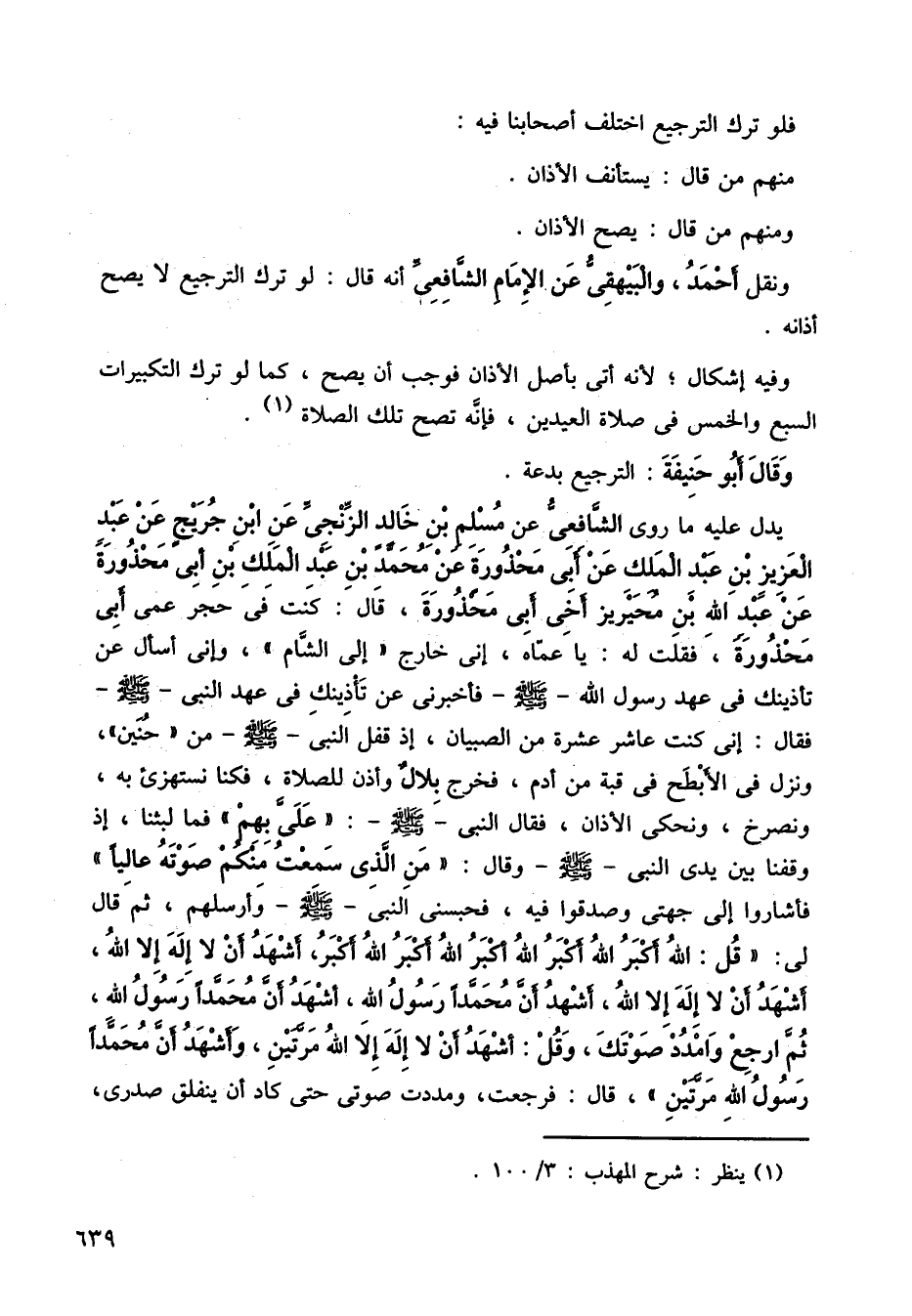 ونقل أحمد، والبيهقي عن الإمام الشافعي أنه قال: لو ترك الترجيع لا يصح أذانه.