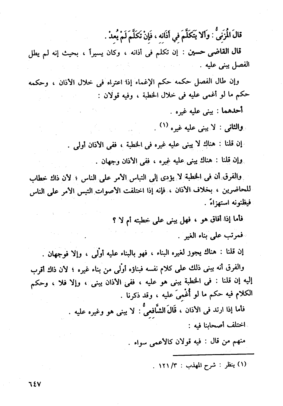 قال المزني: وألا يتكلم في أذانه، فإن تكلم لم يعد.