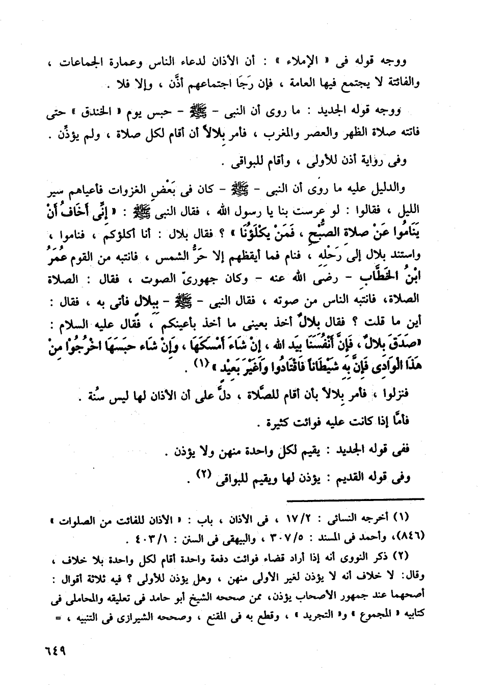 ووجه قوله الجديد: ما روى أن النبي صلى الله عليه وسلم حبس يوم الخندق، حتى فاتته صلاة الظهر والعصر والمغرب، فأمر بلالا أن أقام لكل صلاة، ولم يؤذن وفي رواية أذن للأولى وأقام للبواقي.