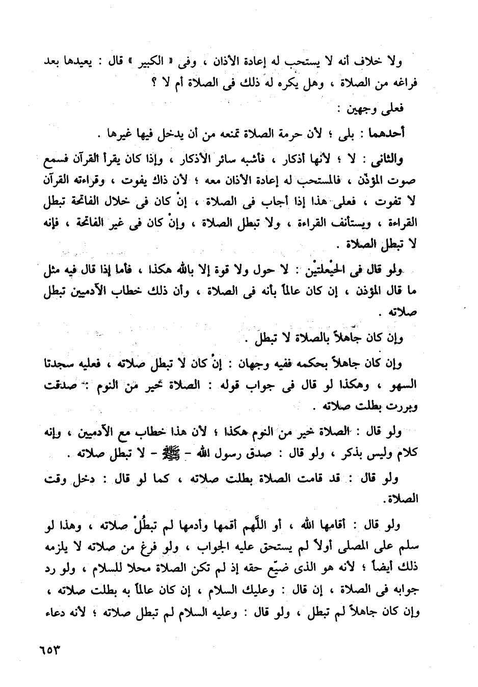 ولو قال: اقامها الله، أو اللهم أقمها وأدمها لم تبطل صلاته، وهذا لو سلم على المصلي أولا لم يستحق عليه الجواب، ولو فرغ من صلاته لا يلزمه ذلك أيضًا؛ لأنه هو الذي ضيع حقه إذ لم تكن الصلاة محلا للسلام، ولو رد جوابه في الصلاة، إن قال: وعليك السلام، إن كان عالمًا به بطلت صلاته، وإن كان جاهلاً لم تبطل، ولو قال: وعليه السلام لم تبطل صلاته، لأنه دعاء