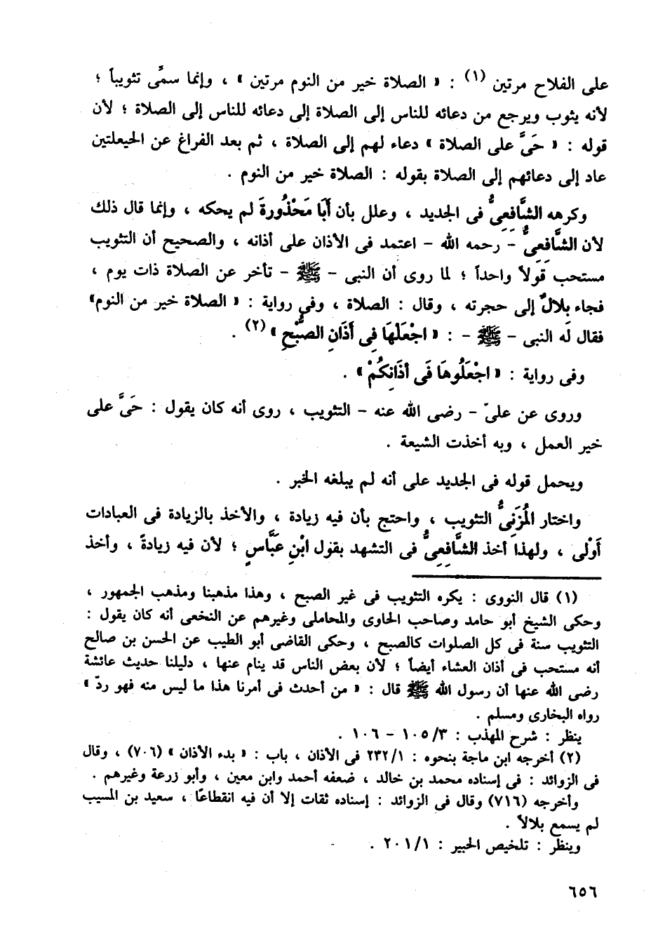 واختار المزني في التثويب: واحتج بأن فيه زيادة، والأخذ بالزيادة في العبادات أولى، ولهذا أخذ الشافعي في التشهد بقول ابن عباس، لأن فيه زيادة، وأخذ.