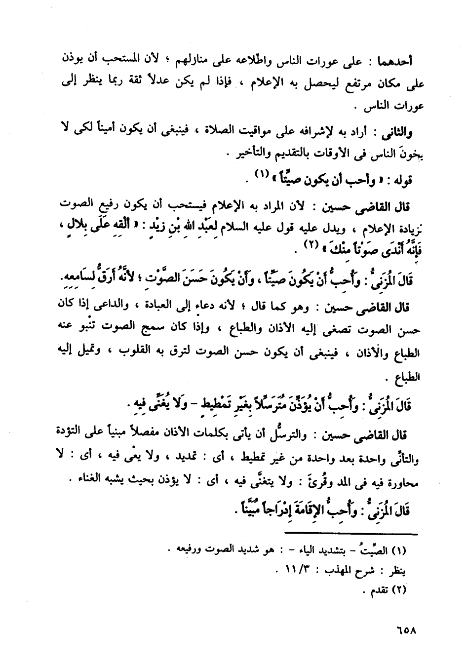 قال المزني: وأحب أن يكون صيتًا، وأن يكون حسن الصوت؛ لأنه أرق لسامعهِ.