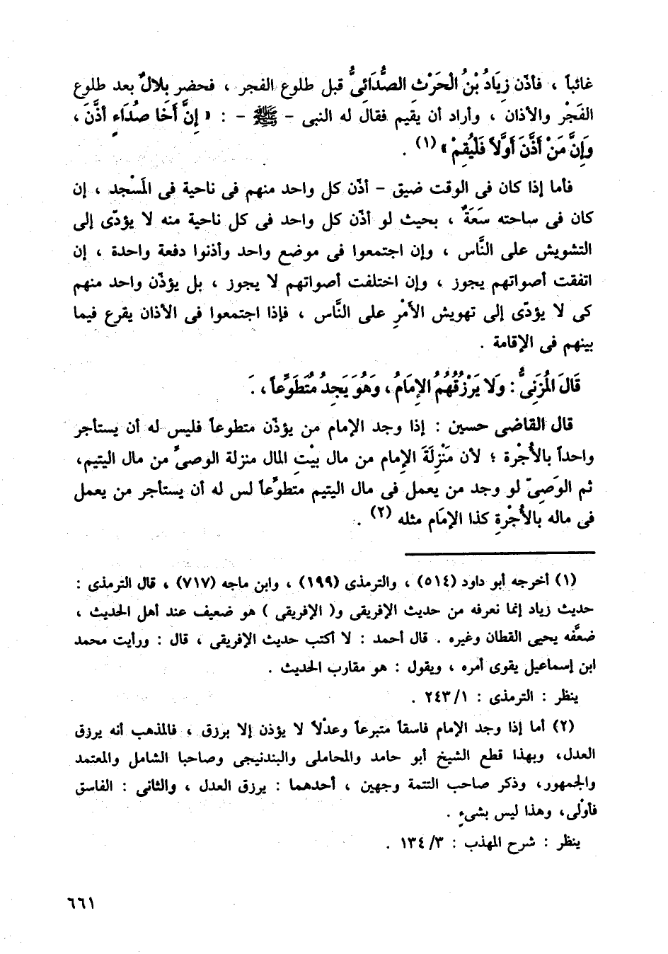 غائبًا، فأذن زياد بن الحرث الصدائي قبل طلوع الفجر، فحضر بلال بعد طلوع الفجر والأذان، وأراد أن يقيم فقال له النبي صلى الله عليه وسلم إن أخا صداء أذن وإن من أذن أولا فليقم.