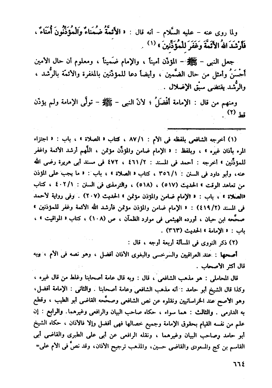 جعل النبي صلى الله عليه وسلم المؤذن أمينًا، والإمام ضمينًا، ومعلوم أن حال الأمين أحسن وأمثل من حال الضمين، وأيضا دعا للمؤذنين بالمغفرة والأئمة بالرشد، والرشد يقتضي سبق الإضلال.