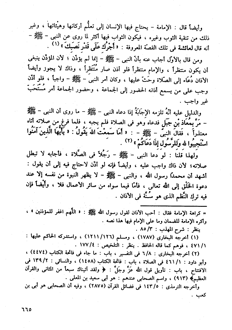 والدليل عليه أنه تلزمه الإجابة إذا دعاه النبي صلى الله عليه وسلم ما روى أن النبي صلى الله عليه وسلم مر بمعاذ بن جبل فدعاه وهو في الصلاة فلم يجبه، فلما فرغ من صلاته أتاه معتذرًا فقال النبي صلى الله عليه وسلم أما سمعت الله يقول: يا أيها الذين آمنوا استجيبوا لله وللرسول إذا دعاكم.