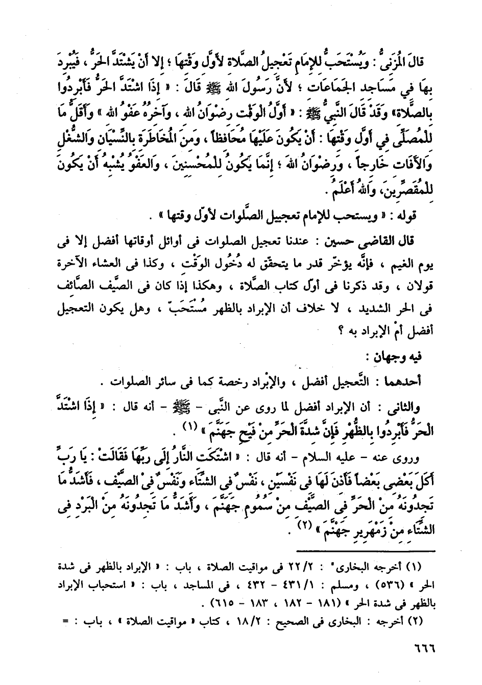 قال المزني: ويستحب للإمام تعجيل الصلاة لأول وقتها، إلا أن يشتد الحر فيبرد بها في مساجد الجماعات، لأن رسول الله صلى الله عليه وسلم قال: إذا اشتد الحر فأبردوا بالصلاة، وقد قال النبي صلى الله عليه وسلم أول الوقت رضوان الله، وآخره عفو الله، وأقل ما للمصلى في أول وقتها: أن يكون عليها محافظًا، ومن المخاطرة بالنسيا والشغل والآفات خارجًا، ورضوان الله، إنما يكون للمحسنين، والعفو يشبه أن يكون للمقصرين، والله أعلم.