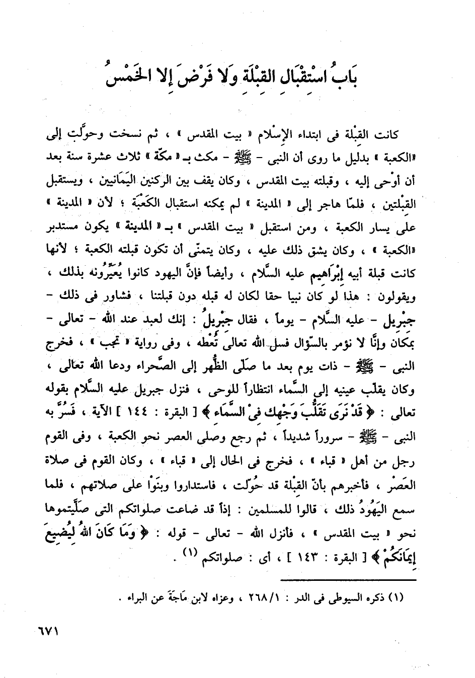 كانت القبلة في ابتداء الإسلام بيت المقدس، ثم نسخت وحولت إلى الكعبة بدليل ما روى ان النبي صلى الله عليه وسلم مكث بـ مكة ثلاث عشرة سنة بعد أو اوحي إليه، وقبلته بيت المقدس، وكا يقف بين الركنين اليمانيين، ويستقبل القبلتين فلما هاجر إلى المدينة لم يمكنه استقبال الكعبة، لأن المدينة على يسار الكعبة، ومن استقبل بيت المقدس بـ (المدينة) يكون مستدبر الكعبة، وكان يشق ذلك عليه، وكان يتمني أن تكو قبلته الكعبة، لأنها كانت قبلة أبيه إبراهيم عليه السلام، وأيضا فإن اليهود كانوا يعيرونه بذلك، ويقولون: هذا لو كان نبيا حقا لكان له قبله دون قبلتا، فشاور في ذلك، جبريل عليه السلام يوما، فقال جبريل: إنك لعبد عند الله تعالى بمكان وإنا لا نؤمر بالسؤال فسل الله تعالى تعطه، وفي رواية تجب، فخرج النبي صلى الله عليه وسلم ذات يوم بعد ما صلى الظهر إلى الصحراء ودعا الله تعالى، وكا يقلب عينيه إلى السماء انتظارًا للوحي، فنزل جبريل عليه السلام بقوله تعالى: (قد نرى تقلب وجهك في السماء)، الآية فسر به النبي صلى الله عليه وسلم سرورًا شديدًا، ثم رجع وصلى العصر نحو الكعبة، وفي القوم رجل من أهل قباء فخرج في الحال إلى قباء وكان القوم في صلاة العصر، فأخبرهم بأن القبلة قد حولت، فاستداروا وبنوا على صلاتهم، فلما سمع اليهود ذلك، قالوا للمسلمين، إذا قد ضاعت صلواتكم التي صليتموها نحو: (بيت المقدس) فأنزل الله تعالى، قوله: (وما كان الله ليضيع إيمانكم)، أي: صلواتكم.