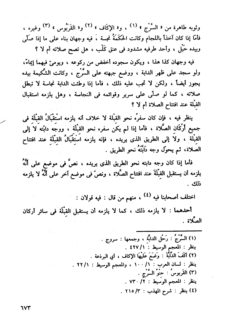 ينظر فيه، فإن كان سفره نحو القبلة لا خلاف أنه يلزمه استقبال القبلة في جميع أركان الصلاة، فأما إذا لم يكن سفره نحو القبلة، ووجه دابته لا إلى القبلة، ولا إلى الطريق الذي يريده، فإنه يلزمه استقبال القبلة عند افتتاح الصلاة، ثم يحول وجه دابته نحو الطريق.