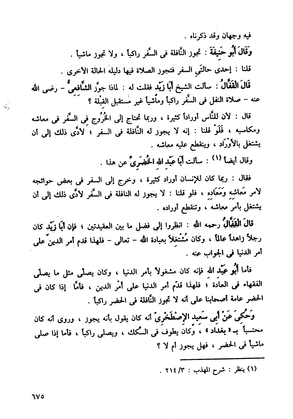 قال القفال: سألت الشيخ أبا زيد فقلت له: لماذا جوز الشافعي، رضي الله عنه، صلاة النفل في السفر راكبًا وماشيًا غير مستقبل القبلة؟