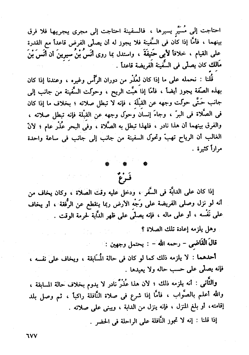احتاجت إلى مسير يسيرها، فالسفينة احتاجت إلى مجرى يجريها فلا فرق بينهما، فأما إذا كان في السفينة فلا يجوز له أن يصلى الفرض قاعدًا مع القدرة على القيام، خلافا لأبي حنيفة، واستدل بما روى أنس بن سيرين أن أنس بن مالك كان يصلي في السفينة الفريضة قاعدًا.