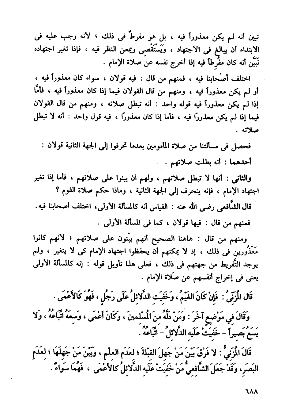 قال المزني: لا فرق بين من جهل القبلة، لعدم العلم، وبين من جهلها، لعدم البصر، وقد جهل الشافعي من خفيت عليه الدلائل كالأعمى، فهما سواء.