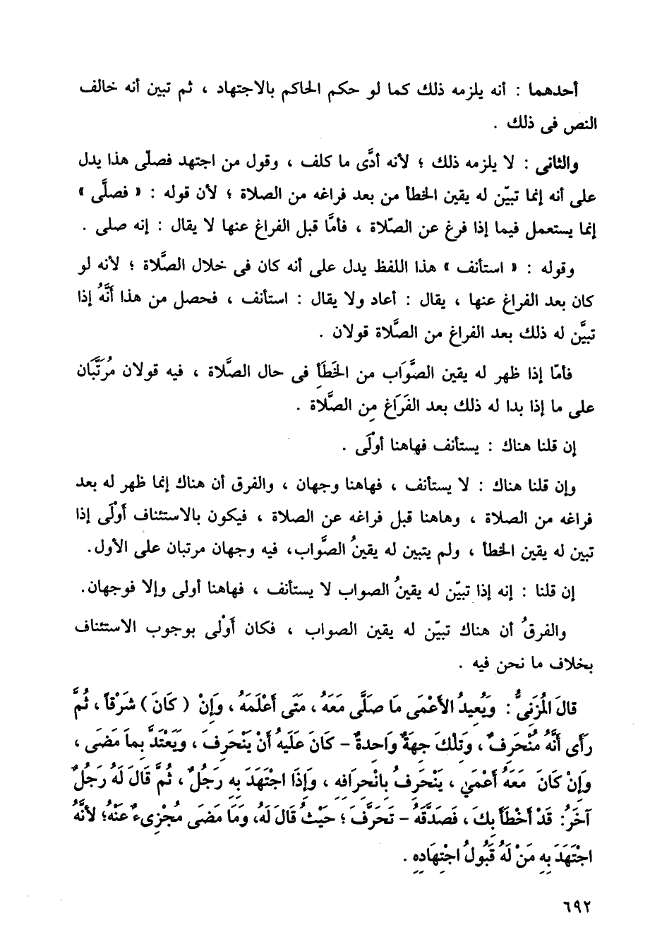 والثاني: لا يلزمه ذلك، لأنه أدى ما كلف، وقول من اجتهد فصلى هذا يدل على أنه إنما تبين له يقين الخطأ من بعد فراغه من الصلاة، لن قوله: فصلى إنما يستعمل فيما إذا فرغ عن الصلاة، فأما قبل الفراغ عنها لا يقال: إنه صلى.