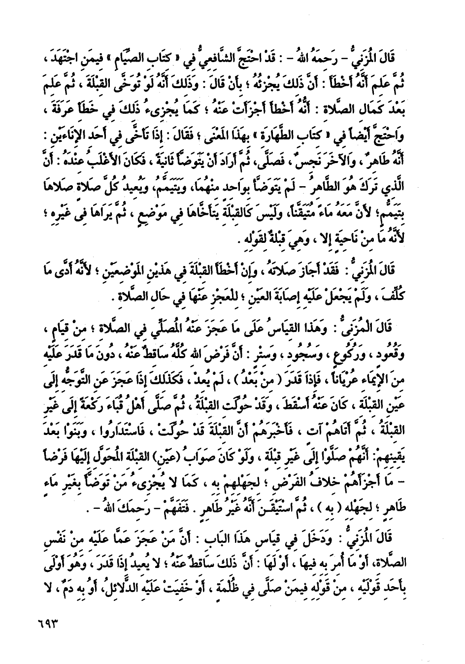 قال المزني: رحمه الله: قد احتج الشافعي في كتاب الصيام فيمن اجتهد، ثم علم أنه أخطأ، أن ذلك يجزئه، بأن قال: وذلك أنه لو توخي القبلة، ثم علم بعد كمال الصلاة: أنه أخطأ أجزأت عنه، كما يجزئ ذلك في خطأ عرفة، واحتج أيضا في كتاب الطهارة، بهذا المعنى، فقال إذا تأخى في أحد الإنائين، أنه طاهر والآخر نجس، فصلى ثم أراد أن يتوضأ ثانية، فكان الأغلب عنده: أن الذي ترك هو الطاهر، لم يتوضأ بواحد منهما، ويتيمم، ويعيد كل صلاة صلاها بتيمم، لأن معه ماء متيقنًاـ، وليس كالقبلة يتأخاها في موضع، ثم يراها في غيره لأنه ما م ناحية إلا وهي قبلة لقوله.